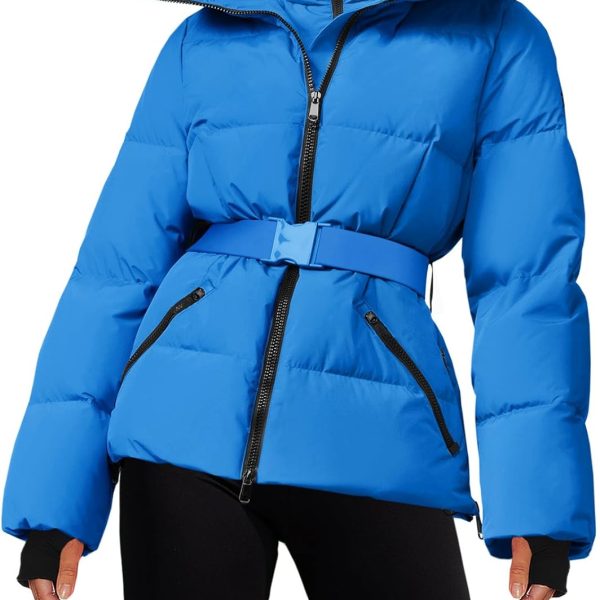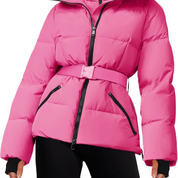 Women Ski Jacket Warm Hooded Insulated Waterproof Quilted Puffy Mountain Snow Winter Coat with Belt